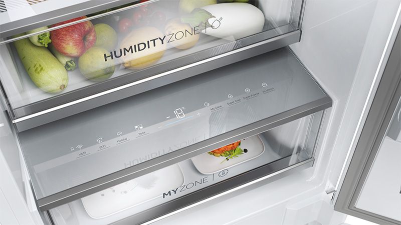 Controlla la conservazione dei tuoi alimenti. Con My Zone puoi personalizzare la temperatura dei compartimenti per ottenere la massima freschezza con un solo tocco, mentre la Humidity Zone mantiene un livello di umidità ideale del 90%, preservando la qualità di frutta e verdura per periodi più lunghi.